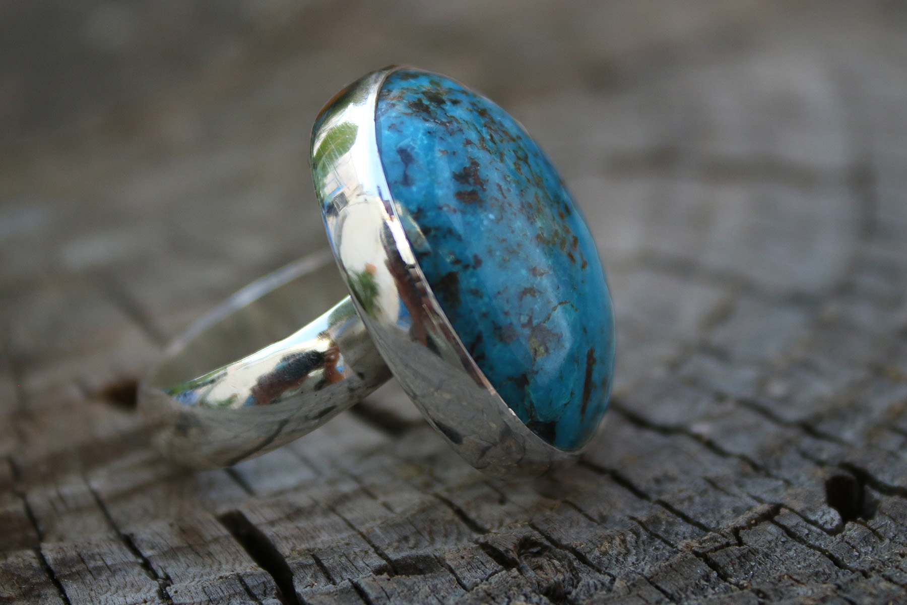 Anillo de Plata 925 con una impresionante Turquesa tibetana, el diseño radica en su sencillez, con una piedra como esta de protagonista, no le hace falta nada más para brillar. El brazo del anillo está hecho con un hilo de media caña de 6mm de ancho y 1,5mm de grosor.