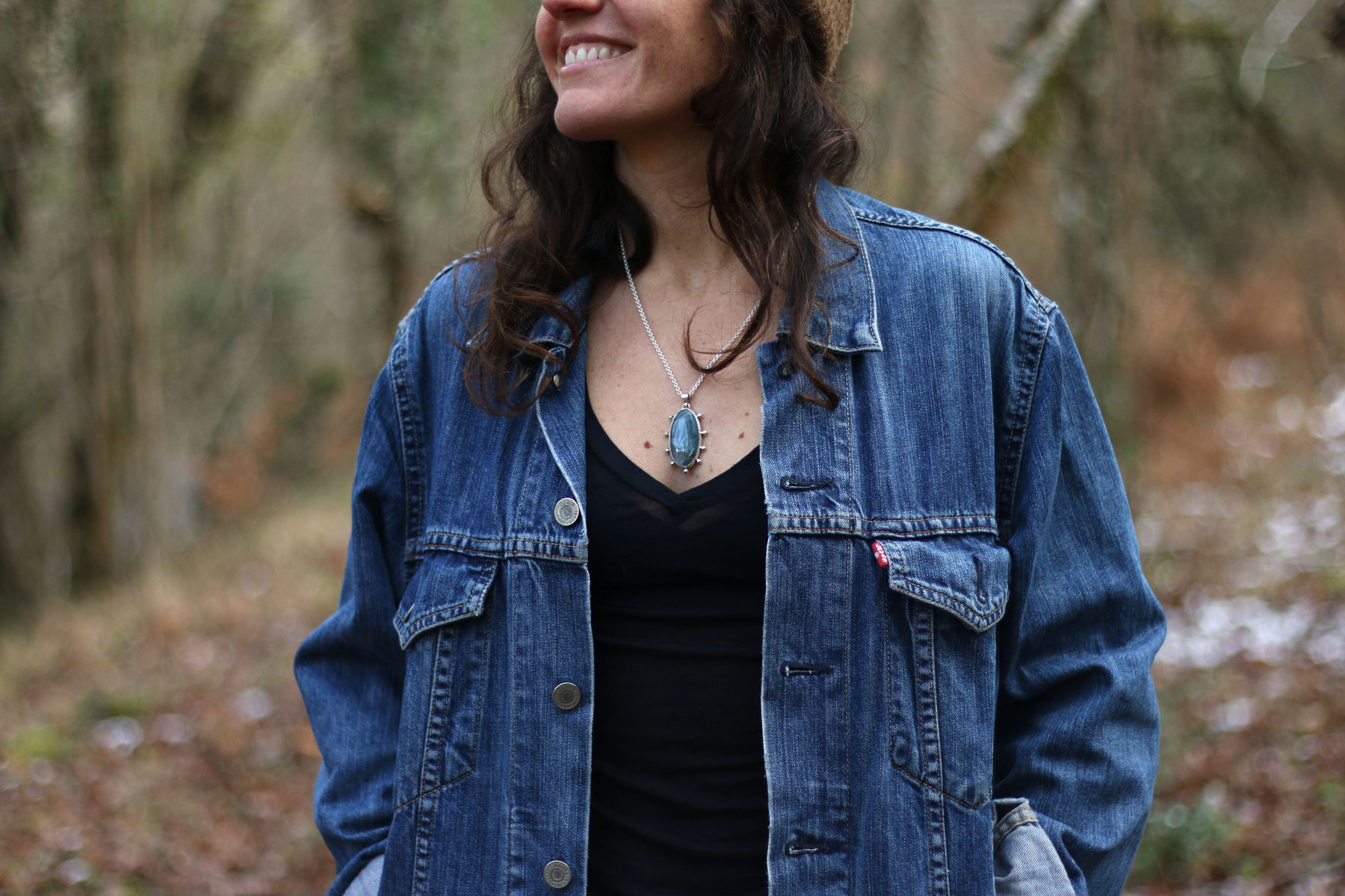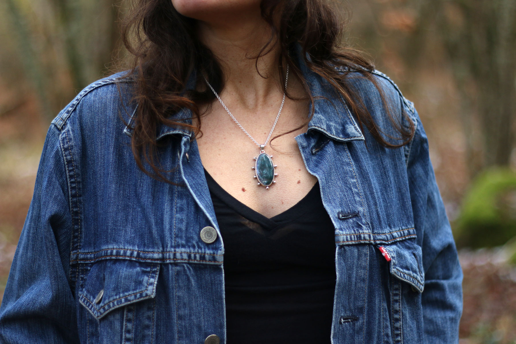 Este colgante tiene en el centro una ágata musgosa, una piedra que siempre me recuerda al bosque por sus vetas verdes y vivas.