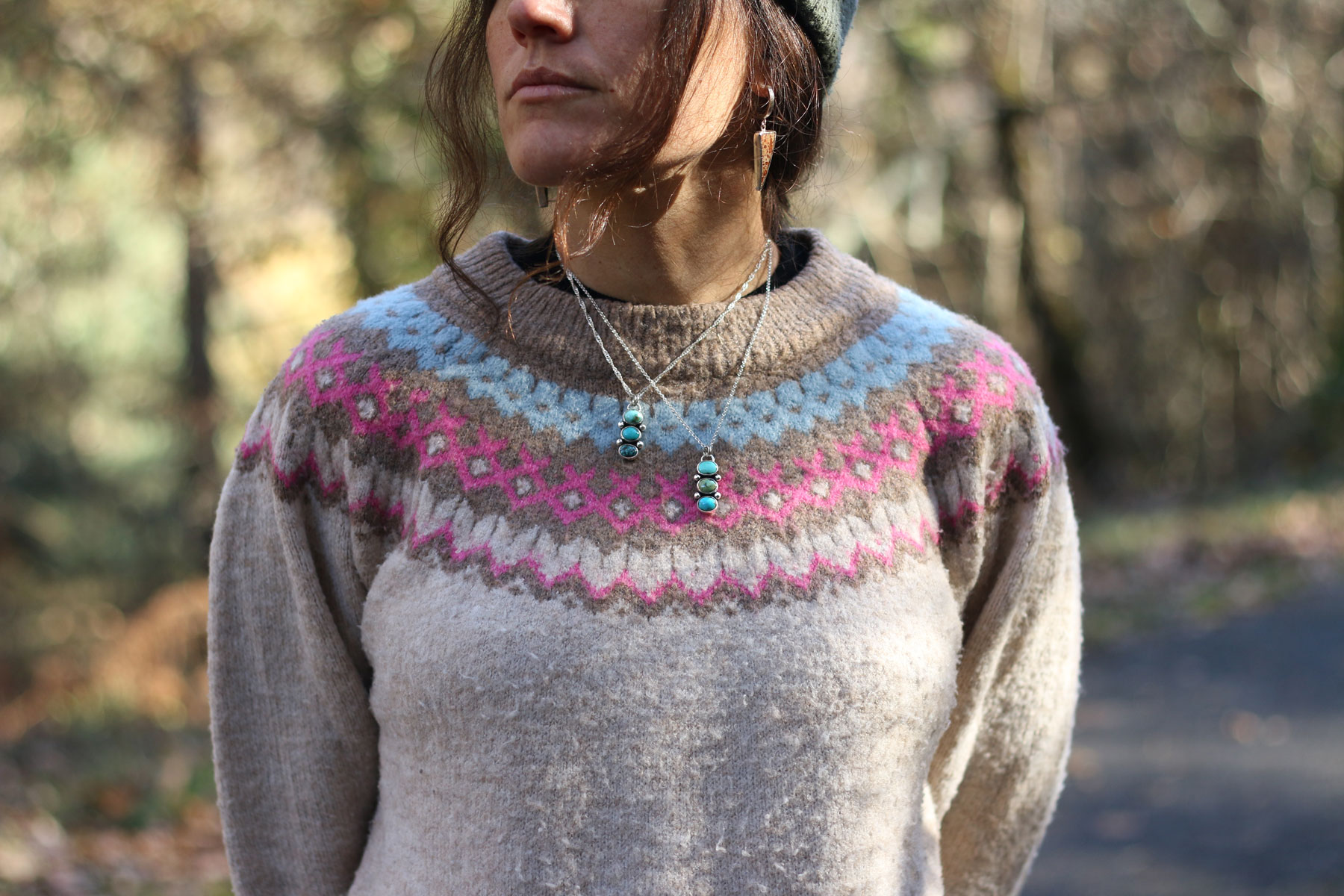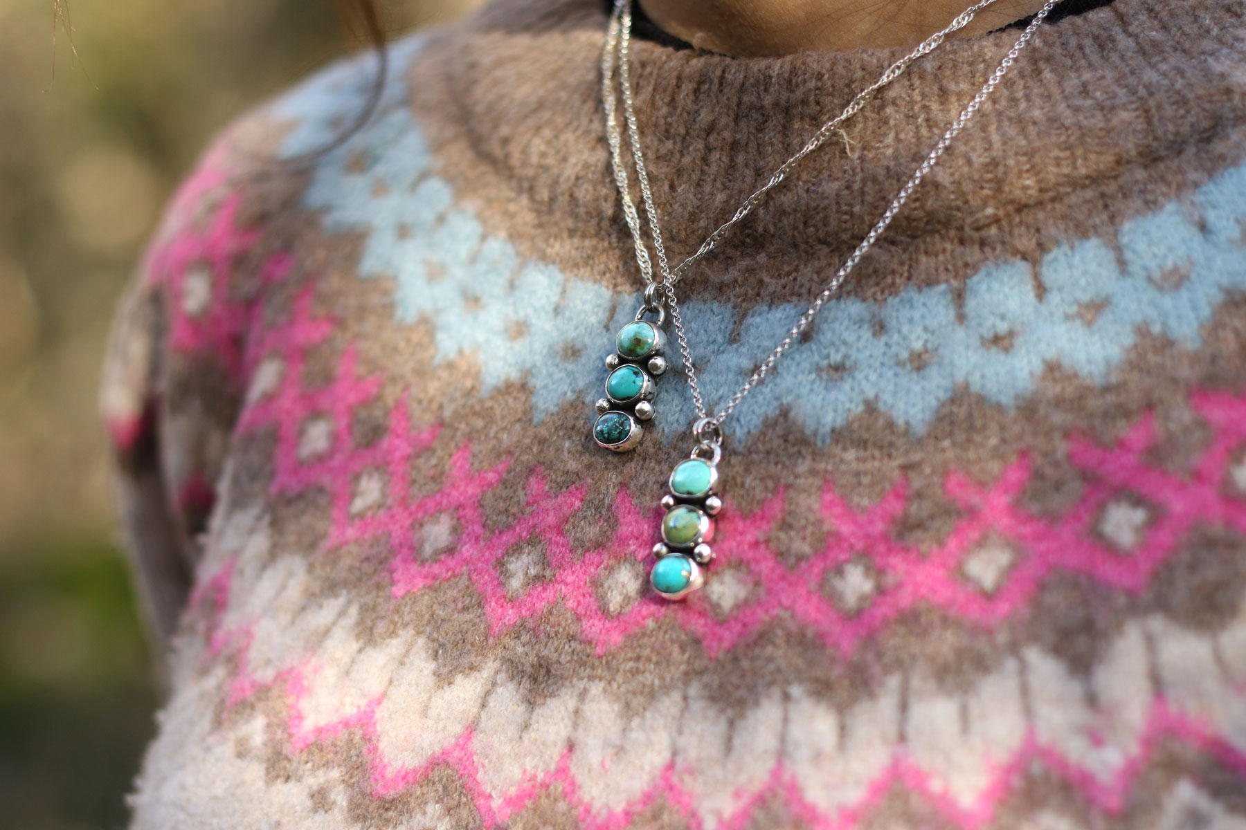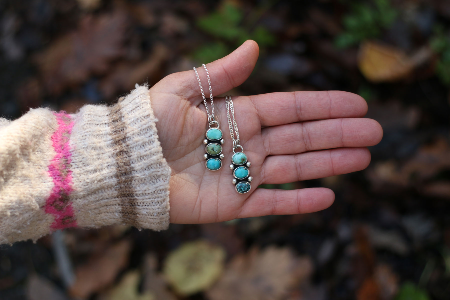 Tres turquesas azul verdosas se reparten sobre la plata, como pequeñas luces entre las ramas. Cada una tiene su propio tono y dibujo, y juntas crean un equilibrio natural, fresco, como un paseo por el bosque después de la lluvia.