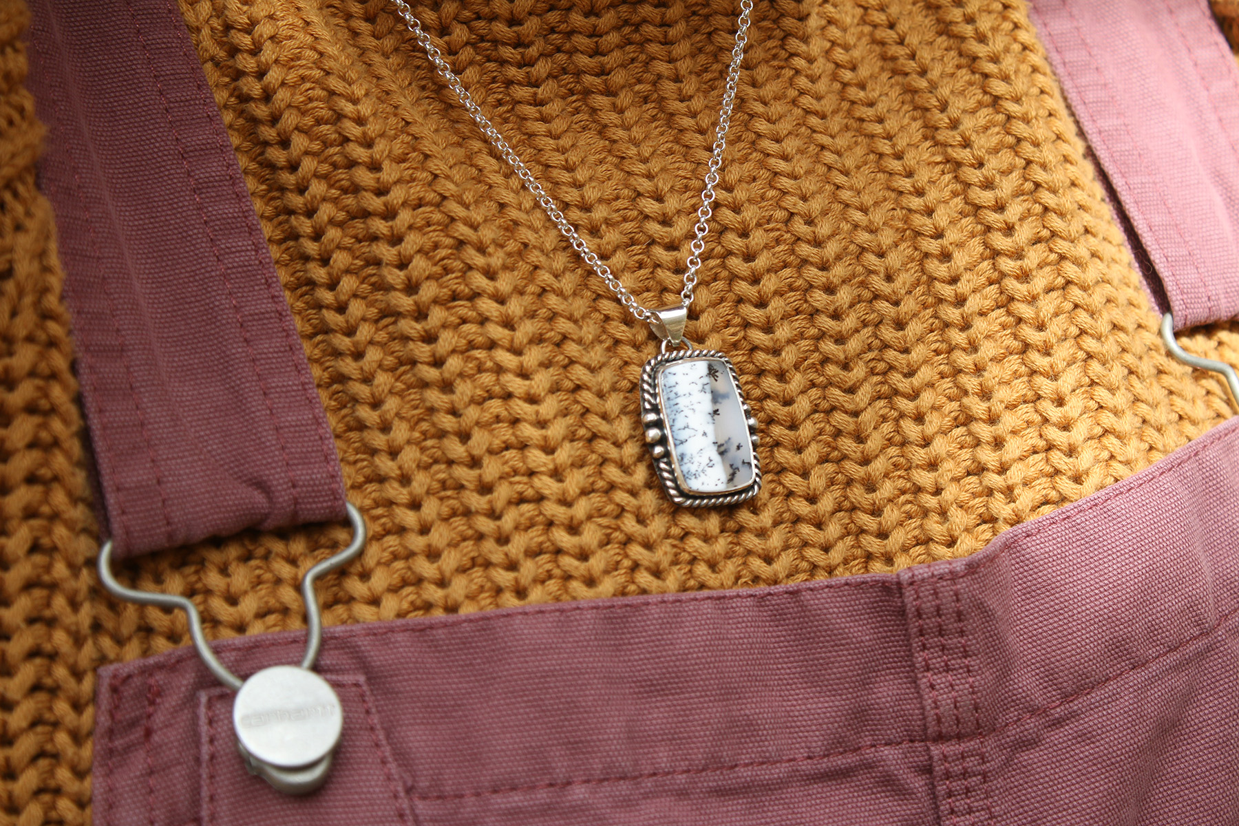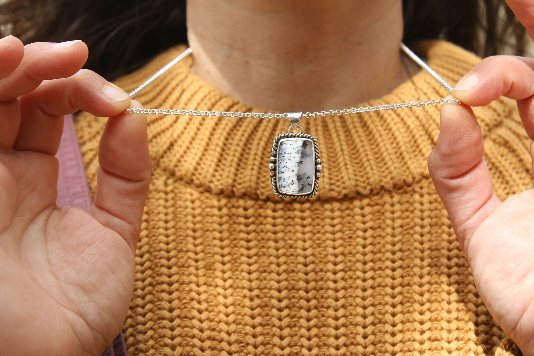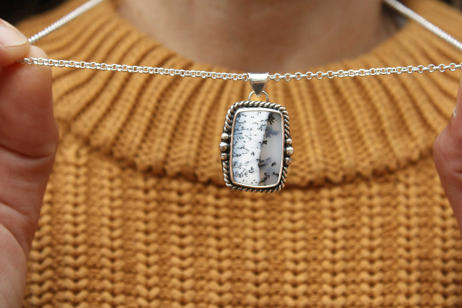 Colgante hecho con Agata Dendritica rectangular, un trenzado artesanal alrededor de la piedra y unas bolitas de plata maciza en los laterales.