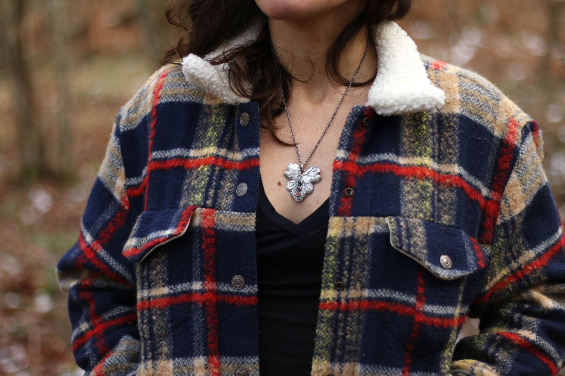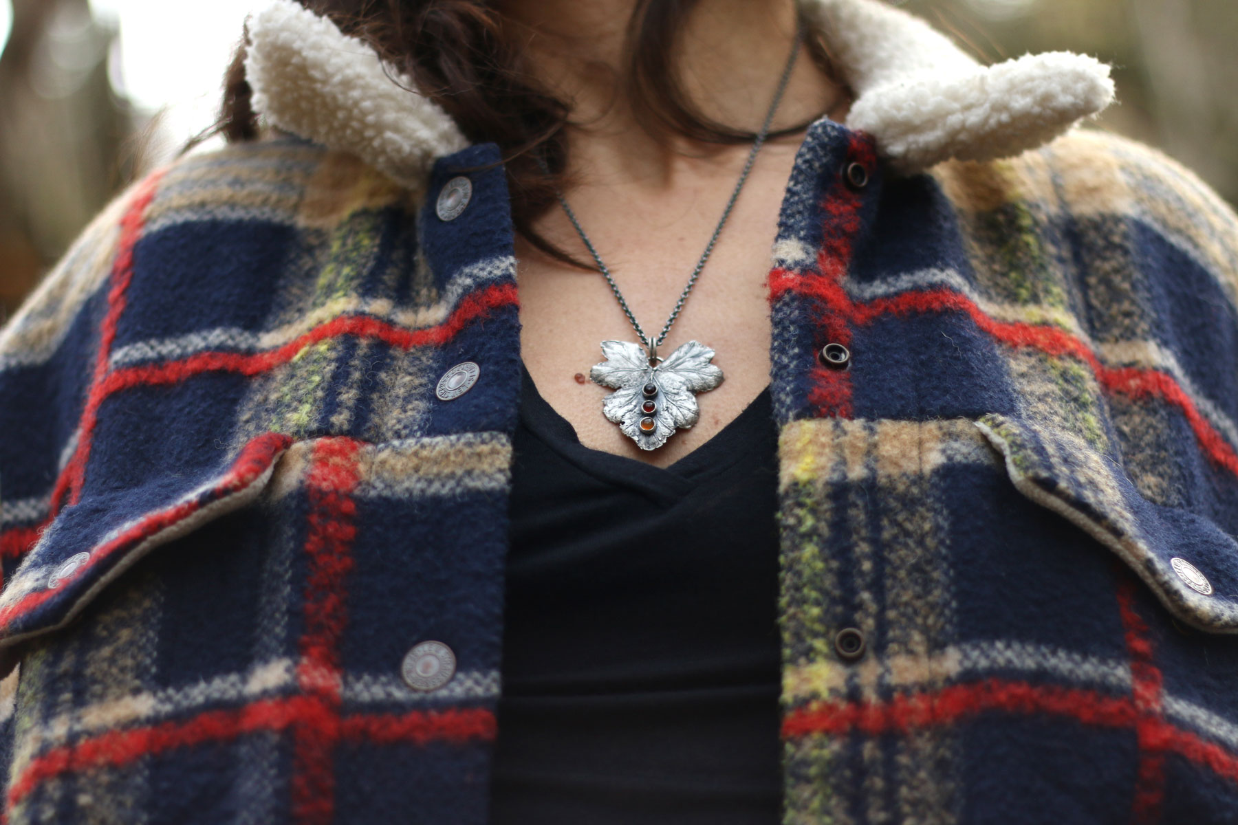 Este colgante está hecho a partir de una hoja real que pasé a fundición, conservando sus nervios y su forma original tal cual la encontré. Sobre ella soldé tres piedras colocadas en línea vertical: la primera, de un tono marrón rojizo profundo; la segunda, más clara; y la tercera, aún más luminosa.
