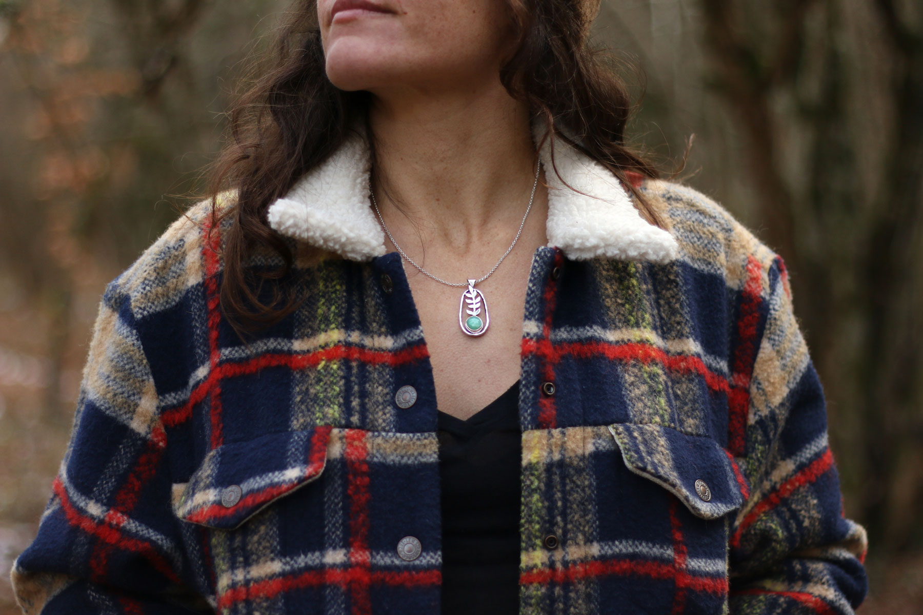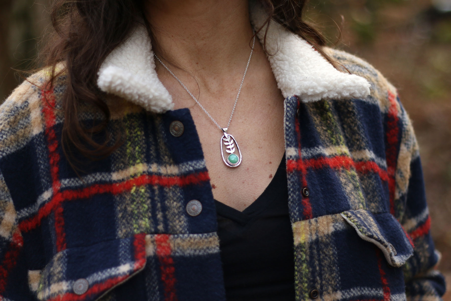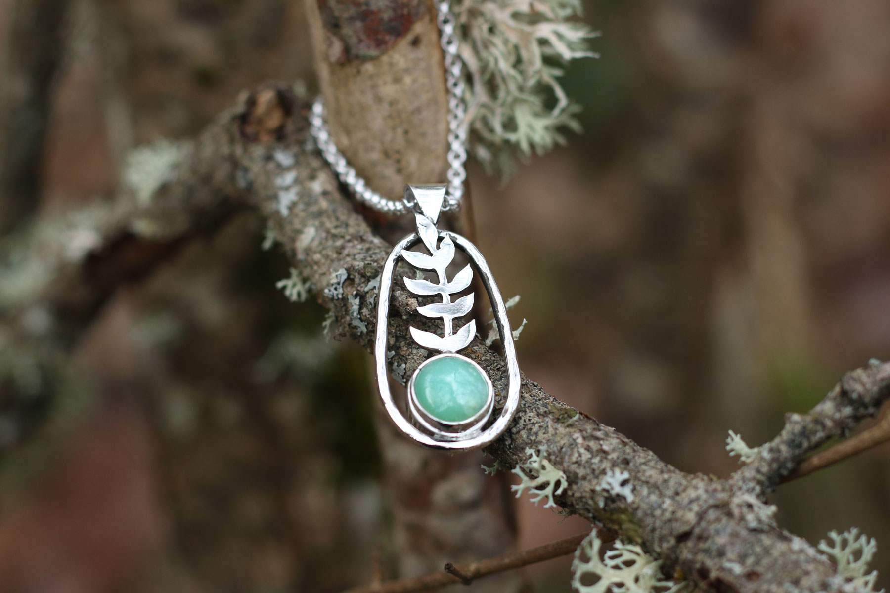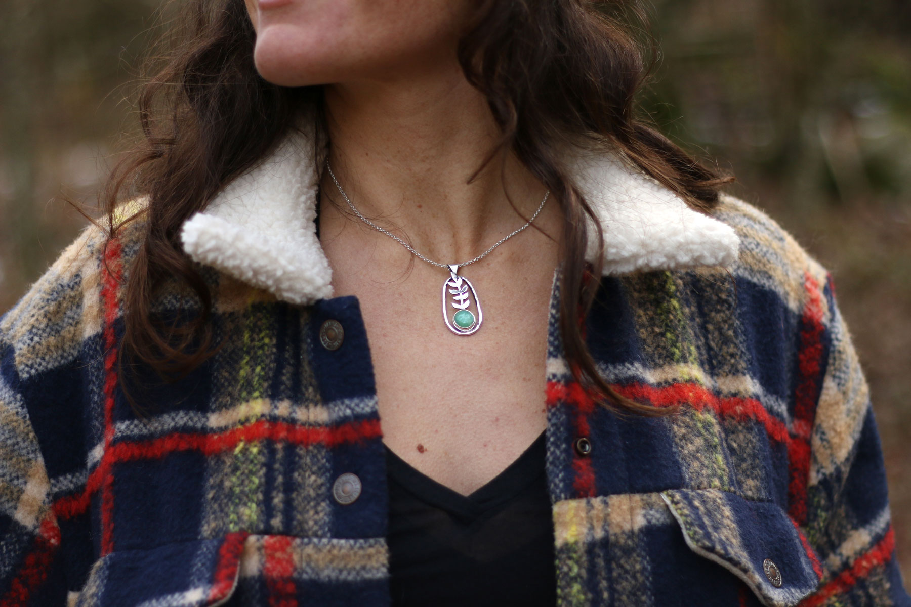 Un diseño inspirado en las formas sencillas del bosque. La estructura de plata abraza una hoja estilizada que parece levantarse, como un brote que busca la luz.