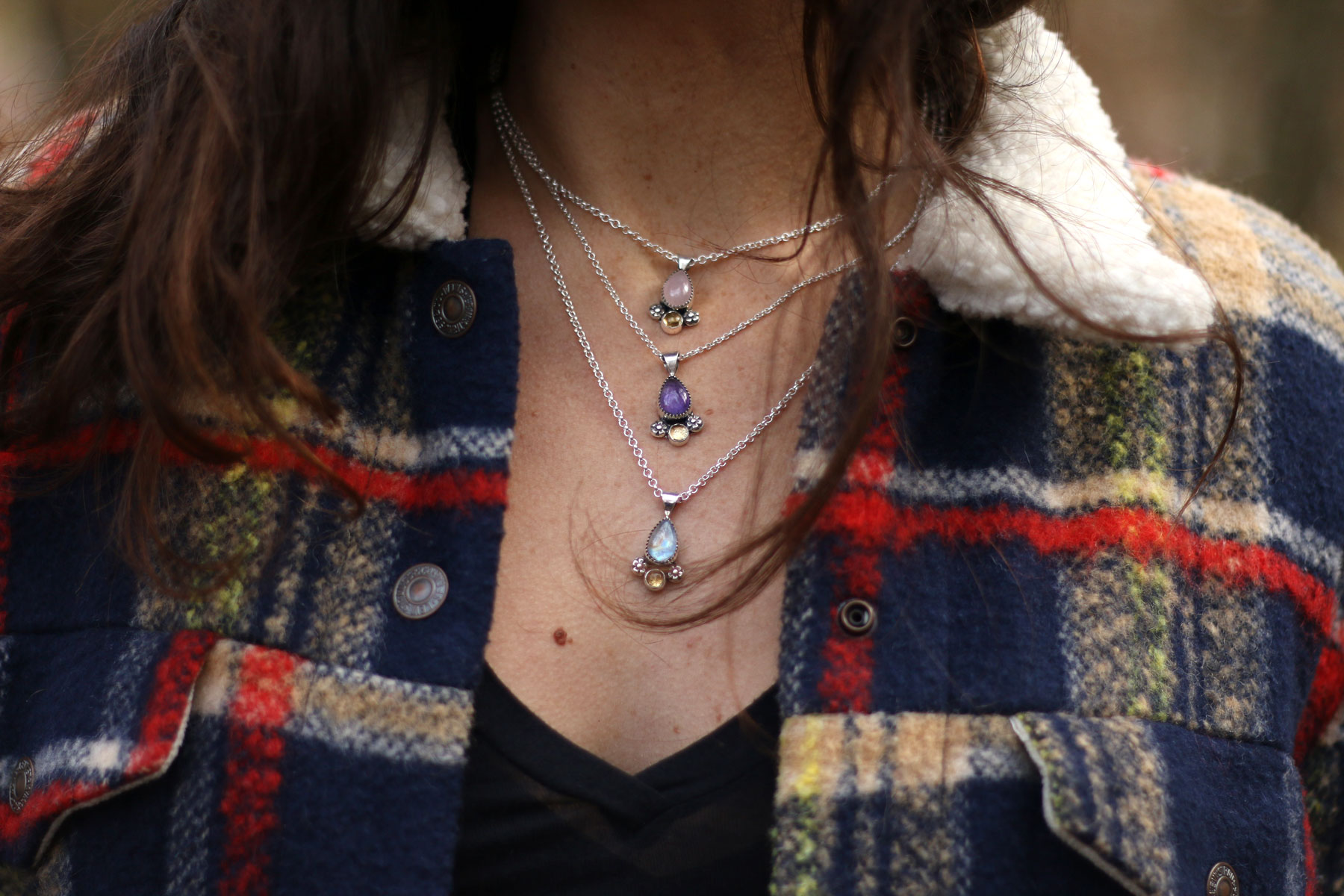 Este colgante nació de un diseño sencillo inspirado en esos pequeños tesoros que uno encuentra paseando por el bosque. La piedra principal va en forma de lágrima y debajo se suma una segunda, creando una caída armoniosa. A los lados soldé dos flores hechas a mano, que aportan ese toque orgánico que buscaba desde el principio.
