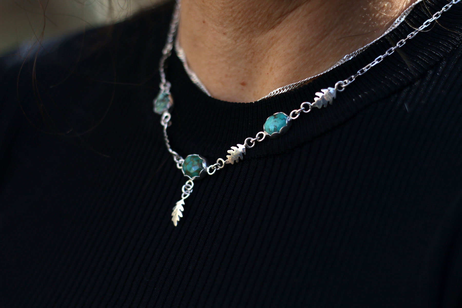 Esta pieza está llena de aire de bosque. En la cadena se reparten tres turquesas azul verdosas, cada una con sus vetas únicas, como pequeñas gotas de cielo entre las ramas.