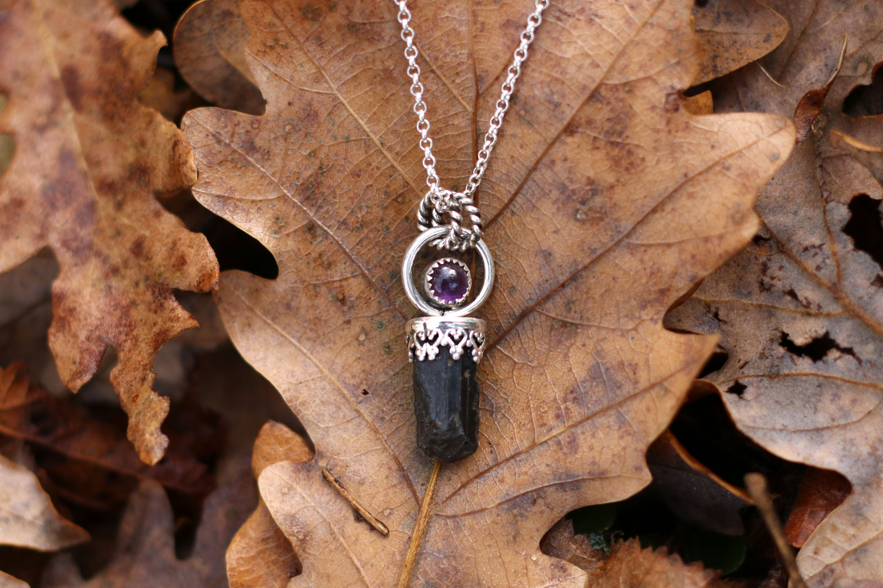 Este amuleto nació del contraste entre dos mundos: la oscuridad profunda de la turmalina en bruto y el brillo violeta de la amatista, que parece encenderse cuando le llega la luz. La turmalina cae como un pequeño fragmento de noche, mientras que la amatista arriba actúa casi como una chispa, un punto de claridad que lo equilibra.
