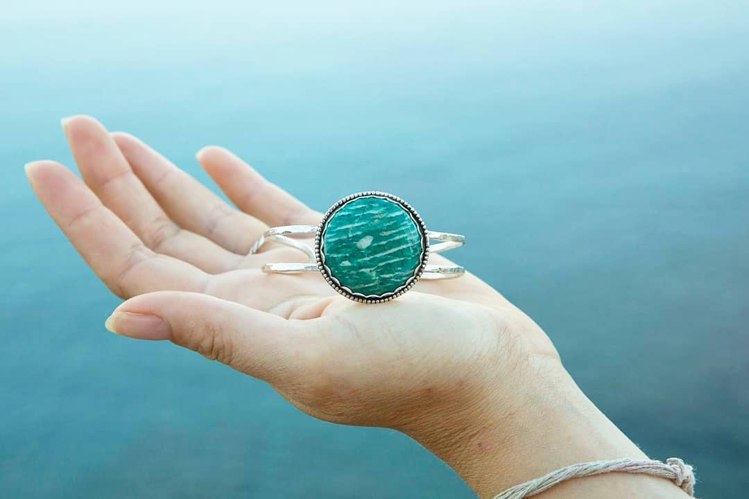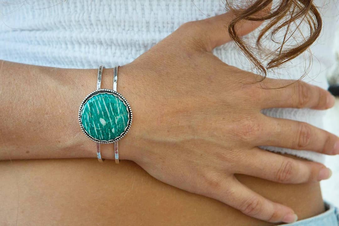 Pulsera hecha de Plata925 y una preciosa amazonita con forma redonda en el medio, envuelta de una tira de bolitas de plata maciza.